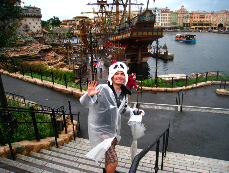 As the night went on and the rain continued to pour, the crowds began to disperse towards the exit where the Disney Sea show began to take place (appropriately named BraviSEAmo. I didn't add the capital letters to the name, that's just how it is), so we wandered right on over that way, and in the process took my favorite picture of the evening. Here's Edgard looking surreal!